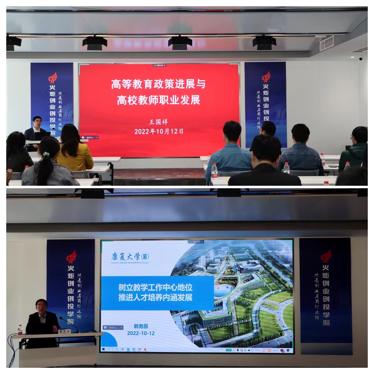 人力資源部負(fù)責(zé)人王國祥作《高等教育政策進(jìn)展與高校教師職業(yè)發(fā)展》講座,從高校教師隊伍建設(shè)政策的變遷、高校教師隊伍建設(shè)的趨勢要求、高校教師發(fā)展的內(nèi)涵和基本路徑、整體規(guī)劃分步實施助力教師發(fā)展四個方面進(jìn)行了細(xì)致講解;教務(wù)部負(fù)責(zé)人管恩京作《樹立教學(xué)工作中心地位,推進(jìn)人才培養(yǎng)內(nèi)涵發(fā)展》講座,從學(xué)校教學(xué)定位、教育教學(xué)之問、人才培養(yǎng)規(guī)劃三個角度,詳細(xì)講解了學(xué)校目前師資隊伍、教務(wù)規(guī)劃和人才培養(yǎng)。