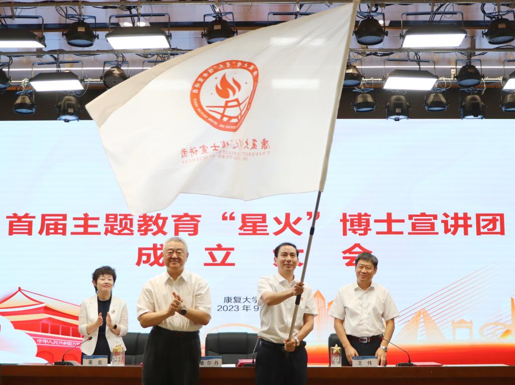 王偉同志宣讀《中共康復大學(籌)臨時委員會關于成立首屆主題教育“星火”博士宣講團的決定》。董爾丹同志為首屆“星火”博士宣講團授旗。學校領導共同為宣講團成員頒發證書。