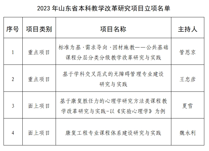 近日,山東省教育廳公布了2023年山東省本科教學(xué)改革研究項(xiàng)目立項(xiàng)名單,學(xué)校推薦的4項(xiàng)課題全部獲批立項(xiàng),其中重點(diǎn)項(xiàng)目2項(xiàng),面上項(xiàng)目2項(xiàng)。