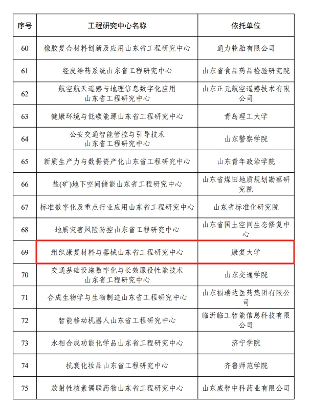 近日,山東省發展和改革委員會發布了《關于公布2024年認定山東省工程研究中心名單的通知》(魯發改高技〔2024〕512號),由康復大學牽頭申報的組織康復材料與器械山東省工程研究中心成功獲批。