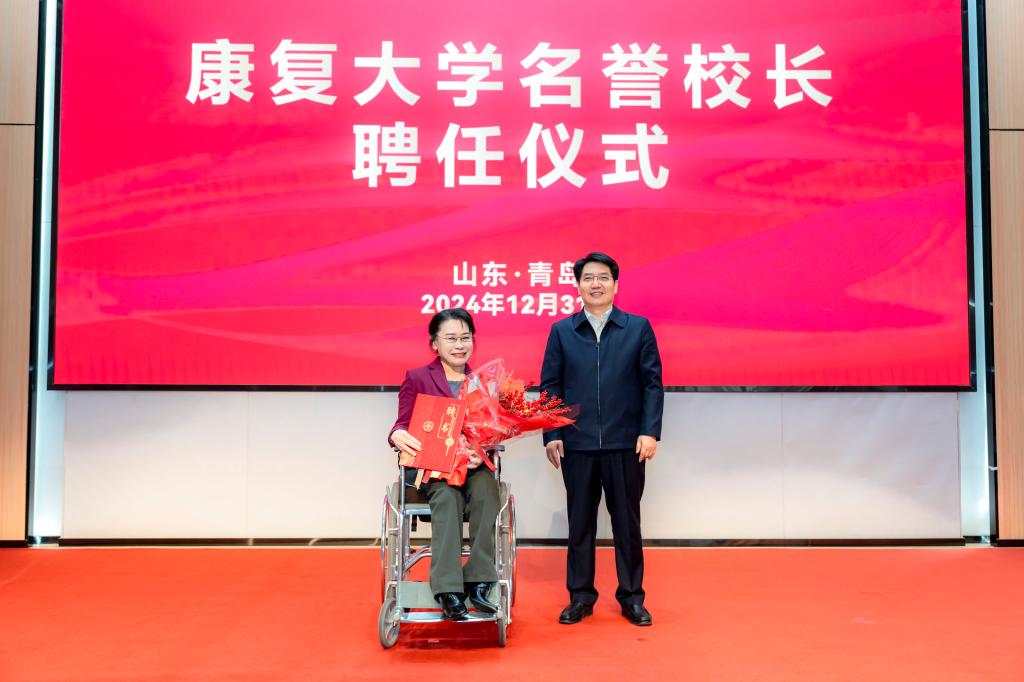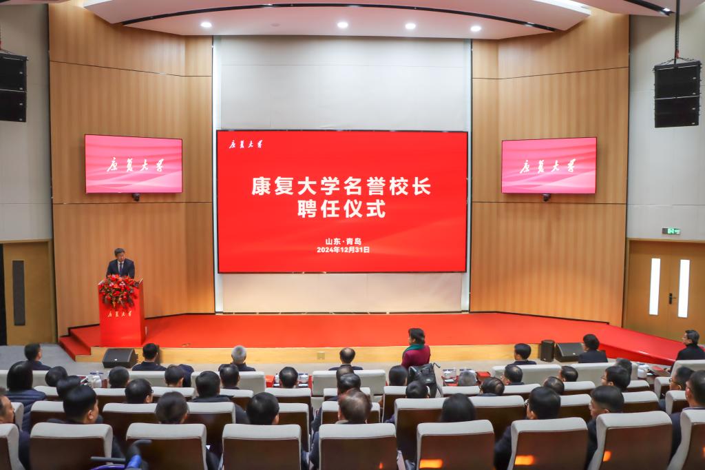 2024年12月31日上午,學(xué)校在行政樓報告廳隆重舉行名譽(yù)校長聘任儀式。中國殘聯(lián)原主席、康復(fù)國際原主席張海迪受聘擔(dān)任康復(fù)大學(xué)名譽(yù)校長。中國殘聯(lián)黨組書記、理事長周長奎出席聘任儀式并致辭,山東省副省長鄧云鋒為張海迪同志頒發(fā)名譽(yù)校長聘書,中國工程院院士、康復(fù)大學(xué)校長董爾丹宣讀關(guān)于聘任張海迪同志為康復(fù)大學(xué)名譽(yù)校長的決定,青島市副市長趙燕代表青島市致辭。中國殘疾人福利基金會理事長趙素京、省政府副秘書長劉斯杰,省委教育工委常務(wù)副書記、省教育廳黨組書記、廳長李明,省委組織部、省委外辦、省殘聯(lián)、省發(fā)改委、省教育廳、省科技廳、省工信廳、省財政廳、省人社廳、省衛(wèi)健委等部門負(fù)責(zé)同志,康復(fù)大學(xué)領(lǐng)導(dǎo)班子成員出席聘任儀式。康復(fù)大學(xué)黨委書記劉軍主持儀式。