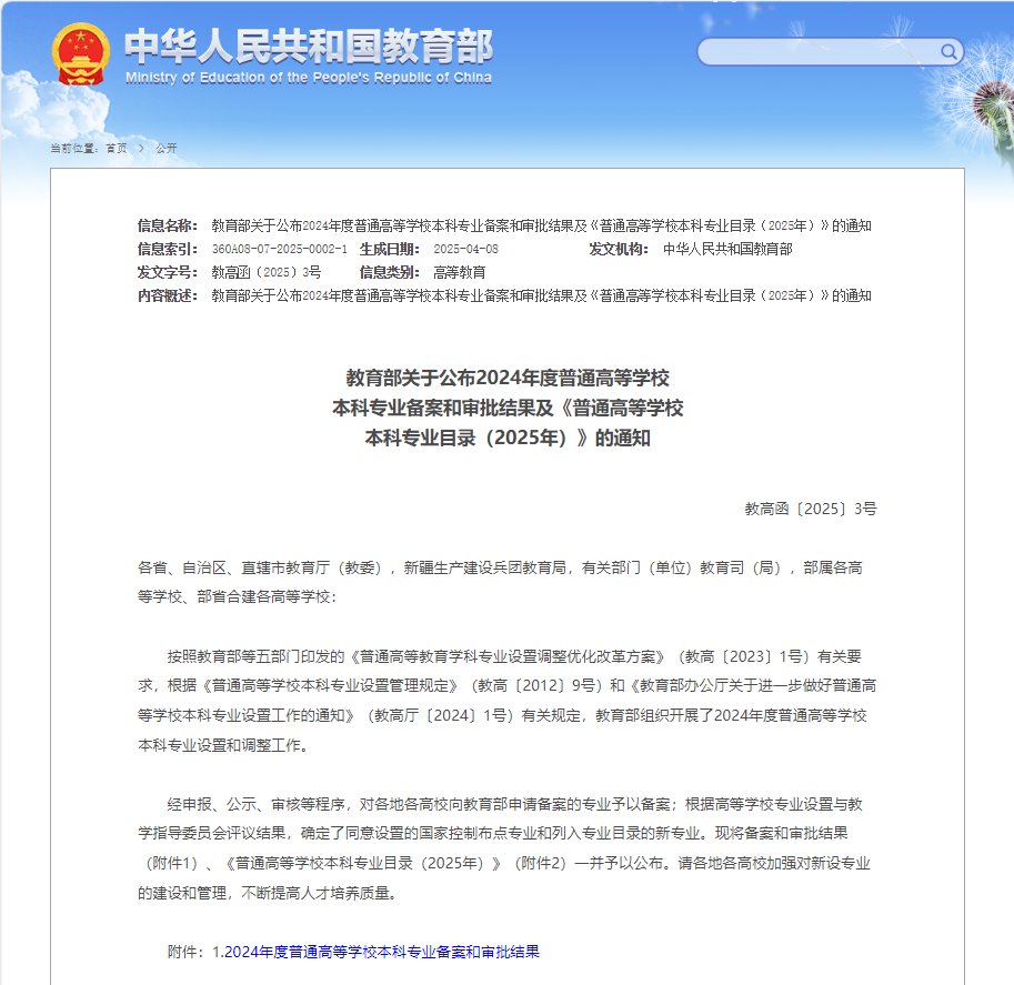 近日,教育部印發《關于公布2024年度普通高等學校本科專業備案和審批結果及〈普通高等學校本科專業目錄(2025年)〉的通知》,我校申報的神經科學、生物材料、智能醫學工程三個專業獲準設置。