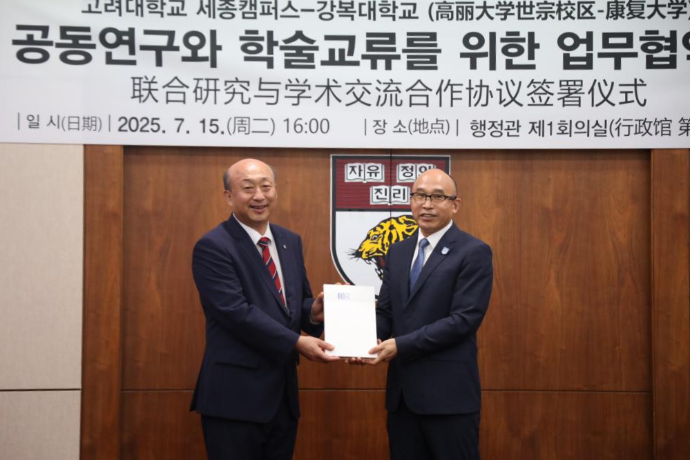 15日下午,代表團訪問了高麗大學世宗校區。高麗大學創建于1905年,在2025年QS世界大學排行榜位列第67位。座談會上,高麗大學副校長、世宗校區校長金榮對康復大學代表團的來訪表示熱烈歡迎。他期望兩校在健康相關學科和大數據領域開展良好合作。劉奇跡向高麗大學建校120周年表示祝賀,他介紹了學校建設發展情況,希望兩校以此次合作備忘錄簽署為契機,不斷加強友好往來,在教育教學和科學研究領域開展務實合作交流。隨后,劉奇跡和金榮分別代表康復大學和高麗大學簽署合作備忘錄。代表團還到該校國際交流院、醫藥學院及AI智能康復與護理實驗室等進行了實地調研,面向相關專業博士研究生進行了海外人才招引宣講活動。