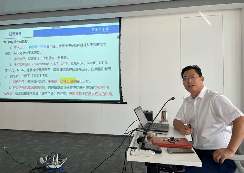 報告中,黃飛教授介紹了脊髓神經(jīng)損傷的研究背景,總結(jié)了脊髓神經(jīng)損傷的主要治療方法及存在的問題,展示了團隊在組織工程化方面治療脊髓損傷的最新研究成果,探討了外源性輔助促進神經(jīng)元軸突生長治療脊髓損傷、探索通過促進內(nèi)源性神經(jīng)干細胞增殖和分化新因子治療脊髓損傷的途徑。報告的最后提出了亟待解決的新問題,并分享了對未來科研工作的展望和計劃。他的報告結(jié)合自身科研經(jīng)歷以及生活實例,深入淺出,把復雜的科學問題變的通俗易懂。