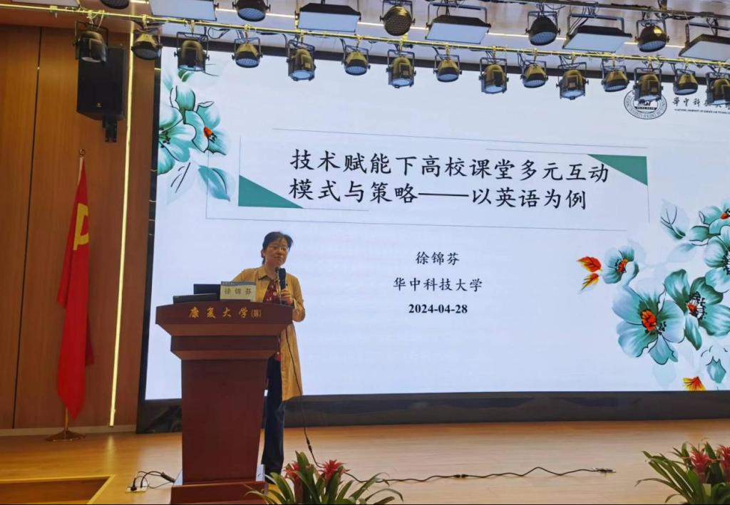 為提升教師教育教學能力,在技術賦能下落實立德樹人根本任務,教務部于4月28日上午邀請華中科技大學二級教授、博士生導師徐錦芬作“技術賦能下課堂多元互動模式與策略--以英語為例”專題講座。公共教學部英語教研室負責人唐建敏教授主持,各學院(部)66名教師參加。