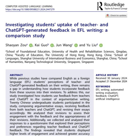 康復大學公共教學部鄒紹艷副教授團隊的論文“Investigating students’ uptake of teacher- and ChatGPT-generated feedback in EFL writing: A comparison study”近日發表于語言學、教育學雙檢索的國際知名學術期刊Computer Assisted Language Learning。該研究創新性地探索了大學生對以ChatGPT為代表的AI工具生成的英語寫作反饋以及教師提供的寫作反饋的吸收情況。研究發現:學生在使用教師反饋時表現出更高的投入度,修訂結果更加準確,但在處理篇章組織和結構性問題時,則更傾向于運用ChatGPT的反饋??傮w而言,學生普遍更偏好教師反饋,但也認可ChatGPT反饋的獨特優勢,尤其是在篇章組織結構方面。這些發現初步表明,以ChatGPT為代表的生成性人工智能在英語寫作教學中具有顯著的輔助作用,進一步明確了其在外語教學中的應用潛力。
