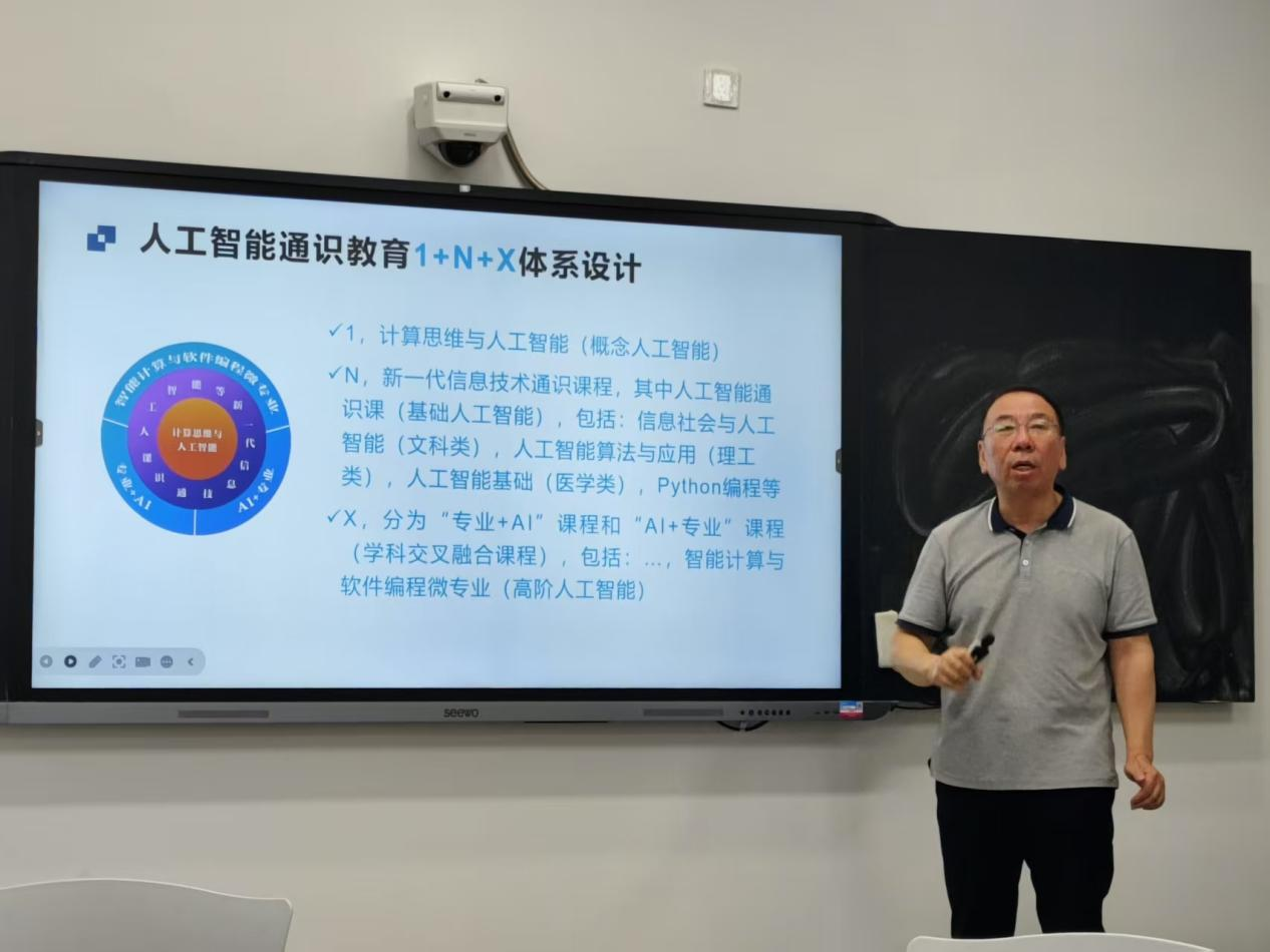 活動(dòng)伊始,山東大學(xué)計(jì)算機(jī)基礎(chǔ)教學(xué)研究中心主任、山東省教學(xué)名師、首屆山東大學(xué)教學(xué)卓越獎(jiǎng)獲得者、教育部高等學(xué)校大學(xué)計(jì)算機(jī)課程教學(xué)指導(dǎo)委員會(huì)資深委員郝興偉教授作題為《AI通識(shí)教育研究改革與實(shí)踐》的主題報(bào)告。郝教授從高校人工智能教育的“兩個(gè)維度”和“三個(gè)層次”切入,系統(tǒng)分析了非人工智能專(zhuān)業(yè)學(xué)生的培養(yǎng)體系,并分享了山東大學(xué)在《計(jì)算思維與人工智能》通識(shí)課程建設(shè)及“智能計(jì)算與軟件編程”微專(zhuān)業(yè)中的實(shí)踐經(jīng)驗(yàn)。他強(qiáng)調(diào),構(gòu)建“概念-基礎(chǔ)-高階”分層教學(xué)體系是培養(yǎng)跨學(xué)科AI人才的關(guān)鍵。