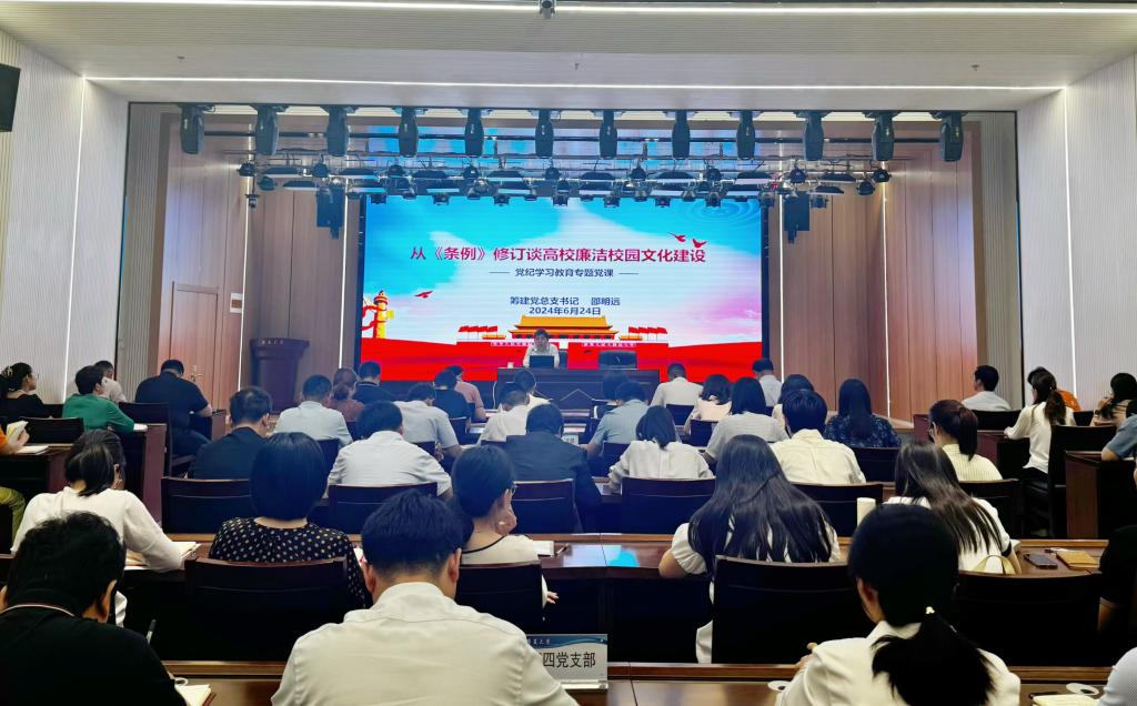 6月24日上午,根據學校黨紀學習教育工作安排,籌建黨總支書記邵明遠同志在106會議室作黨紀學習教育專題黨課。學校全體黨員參加黨課學習。