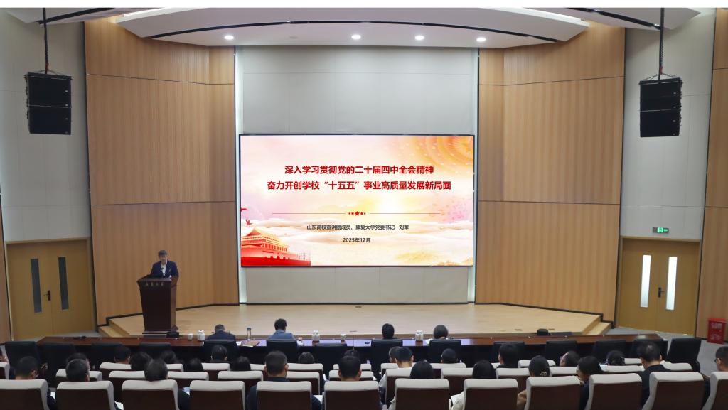 12月18日上午,學(xué)校在行政樓報告廳舉行黨的二十屆四中全會精神宣講報告會。山東省高校宣講團成員、學(xué)校黨委書記劉軍以“深入學(xué)習(xí)貫徹黨的二十屆四中全會精神 奮力開創(chuàng)學(xué)校‘十五五’事業(yè)高質(zhì)量發(fā)展新局面”為題作主旨報告。學(xué)校領(lǐng)導(dǎo)班子成員、管理干部及教師代表近200人現(xiàn)場聆聽。
